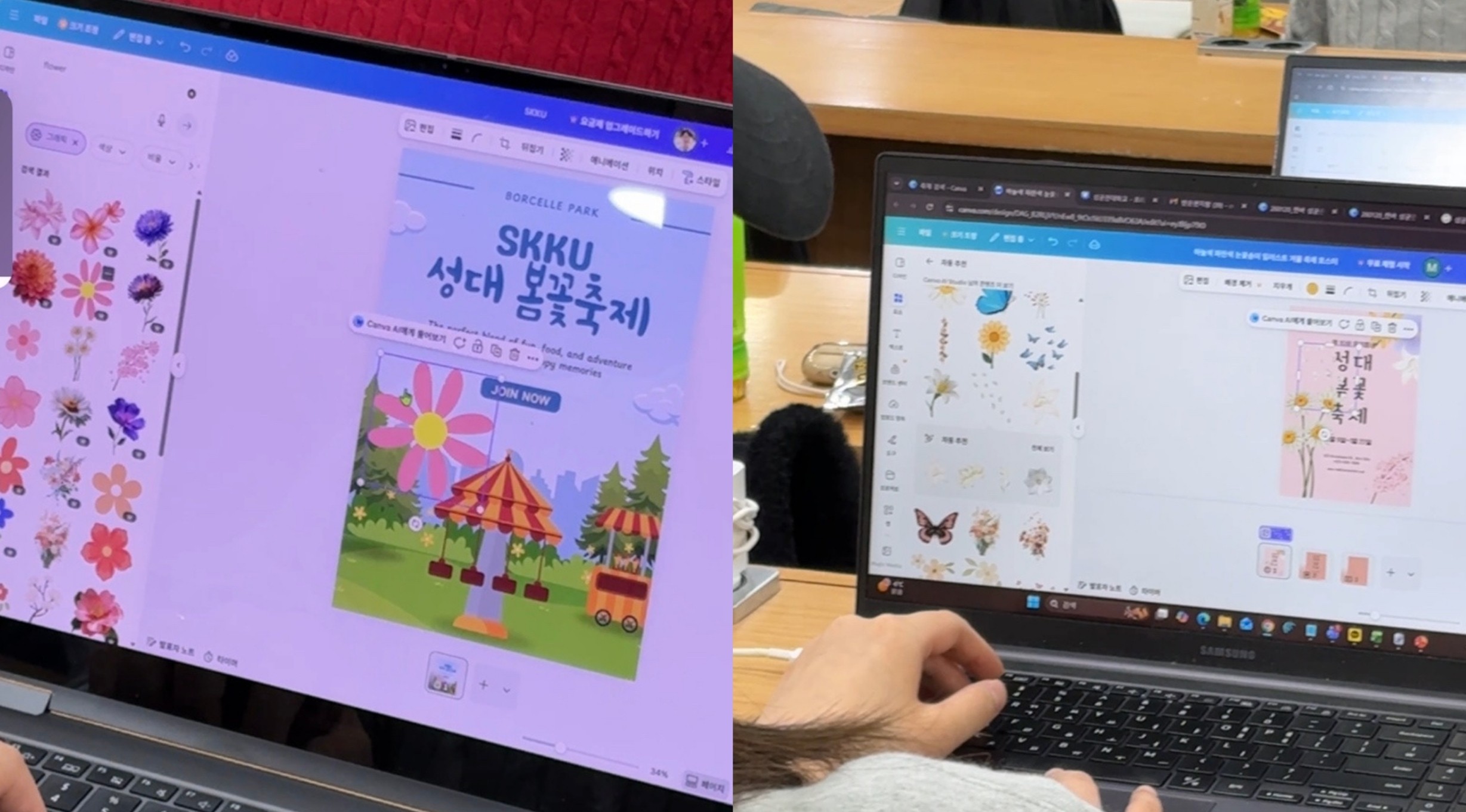 A1: 네, 충분히 가능합니다. 이번 성균관대 특강에서도 디자인이 익숙하지 않은 대학원생들이 캔바의 기초 UI 및 핵심 기능 사용법을 숙지하고, 캔바에서 제공하는 다양한 AI 기능과 템플릿을 활용해 단 3시간 만에 포스터를 직접 제작하고 완성했습니다. 즉, 처음 사용하는 분들도 캔바 교육 파트너 소속 전문 강사의 교육을 통해 짧은 시간 안에 결과물을 만들 수 있을 만큼 진입장벽이 낮은 도구입니다.