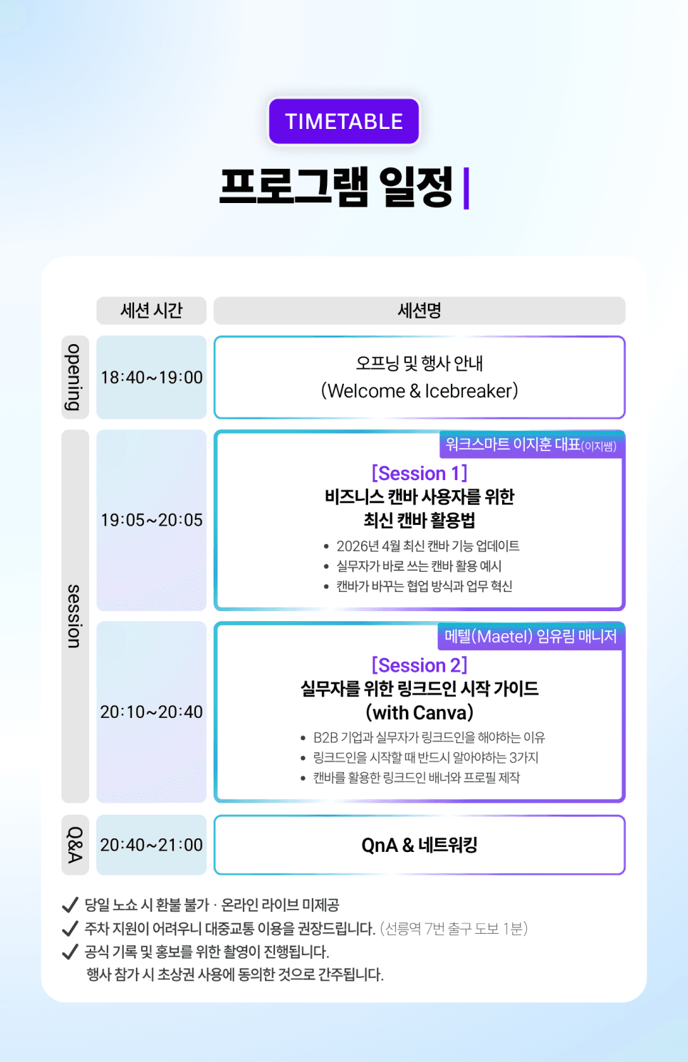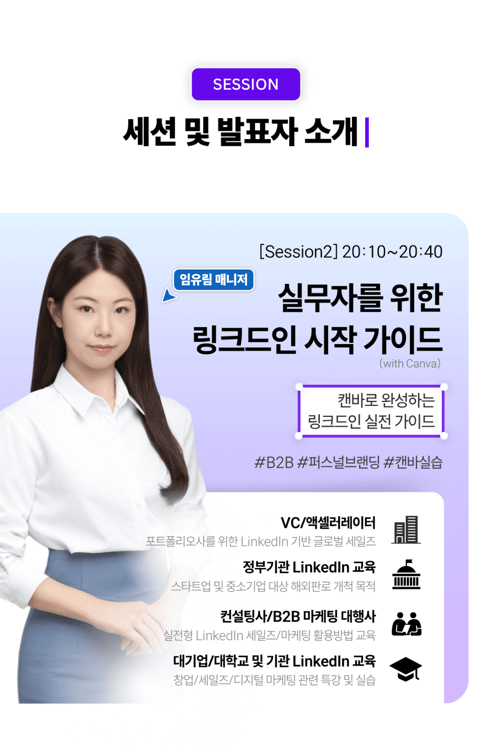 20:10 – 20:40 | Session 2 | 당신의 프로필이 브랜드가 되는 캔바로 완성하는 링크드인 콘텐츠 임유림 매니저 · 메텔 |