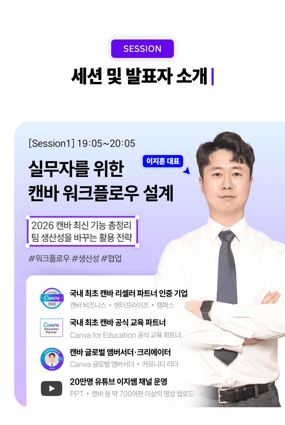 19:05 – 20:05 | Session 1 | 2026 캔바 AI 기능을 활용한 워크플로우 이지훈 대표 · 워크스마트 |