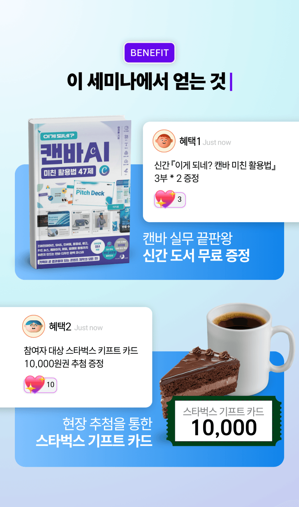 참가비는 10,000원입니다. 현장에서 캔바 AI 실무 도서와 강의 자료를 전원 증정하며, 스타벅스 기프트카드 10,000원 추첨도 진행합니다.