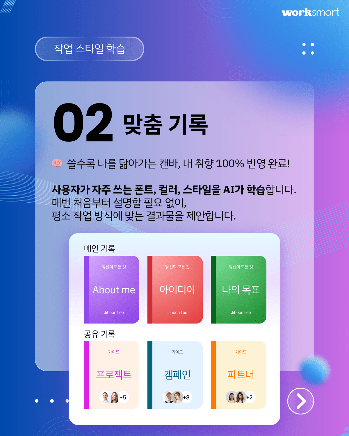 매번 원하는 레이아웃과 스타일을 반복 설명할 필요가 없습니다. Canva AI 2.0은 사용자가 자주 만드는 디자인 스타일을 학습하고, 점점 더 사용자의 취향에 맞는 결과물을 제안합니다. 기존 작업물을 학습시켜 커스텀 메모리 라이브러리처럼 활용할 수 있다는 점이 핵심입니다.