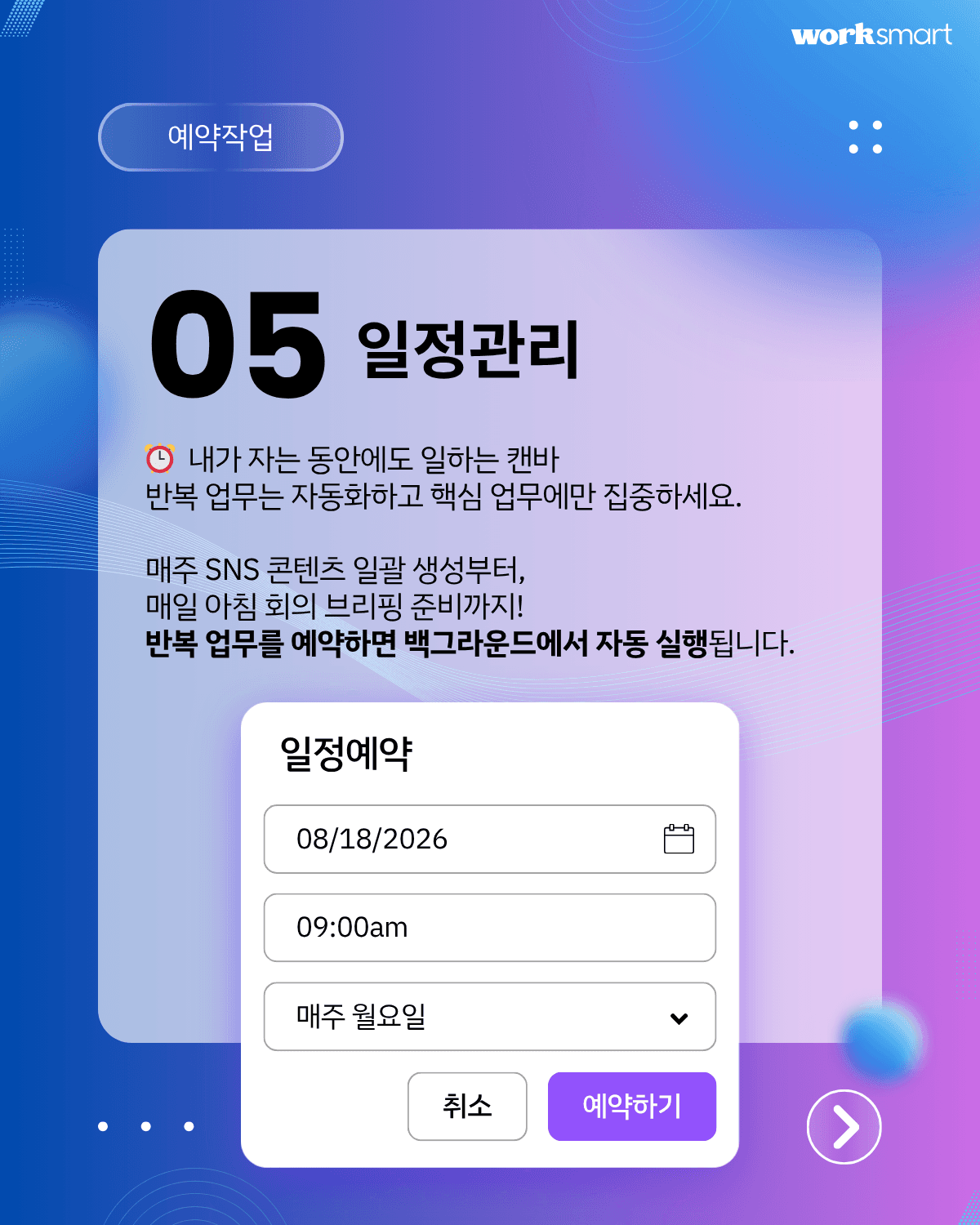 반복 업무를 매번 수동으로 시작하지 않아도 됩니다. 특히 콘텐츠 운영, 마케팅, 내부 커뮤니케이션 업무처럼 주기성이 강한 작업에서 효율이 높습니다.