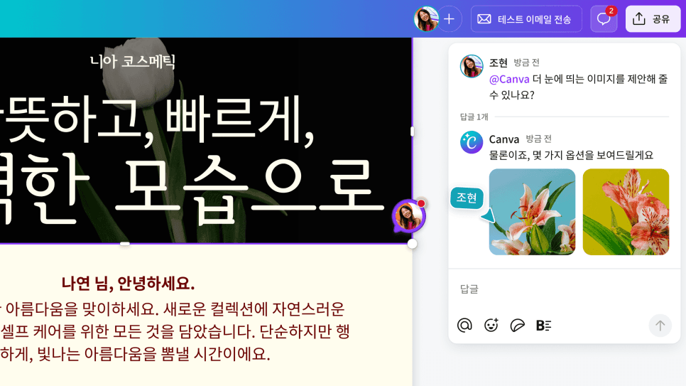 댓글창에 @Canva를 입력하면 AI가 다음과 같은 도움을 제공합니다.